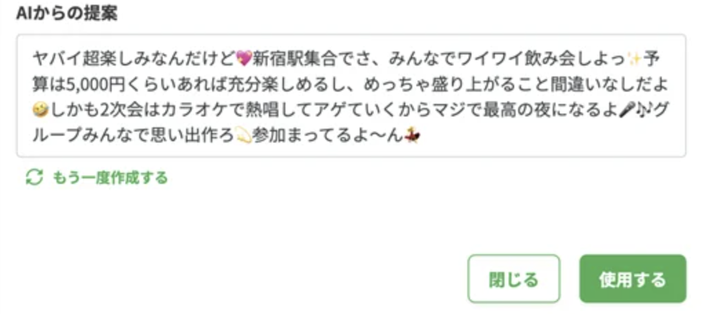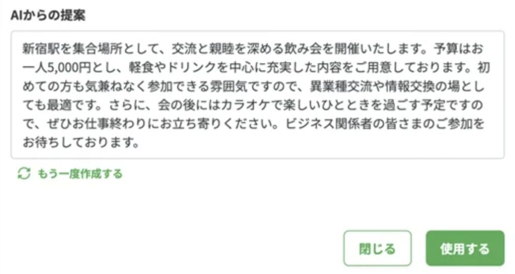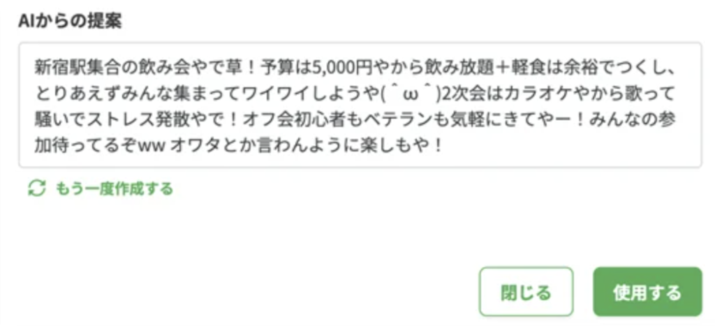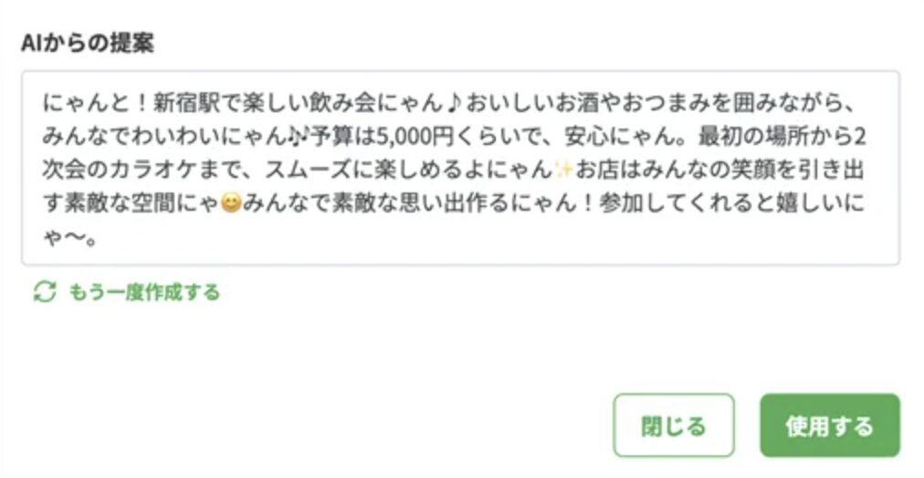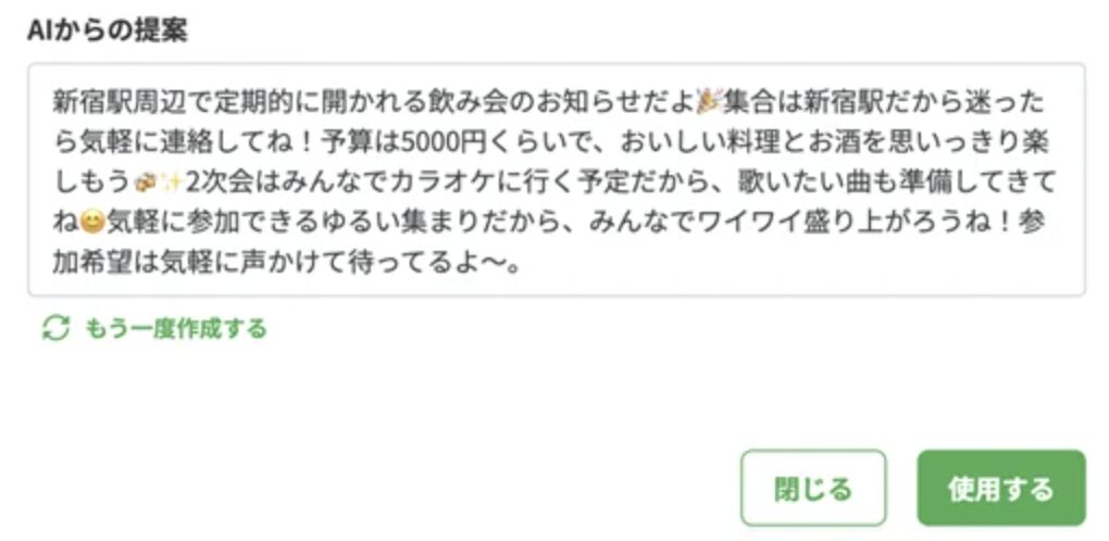 幹事が、イベントの日時や場所、会費などを「メモ欄」に入力することで、AIが案内文を代わりに作ってくれる機能です。文章に悩むことがなくなるため、幹事はこれまで以上に短時間でイベントページを作ることができます。文章の長さや文体も選択が可能です。シーンに合わせてご使用ください。