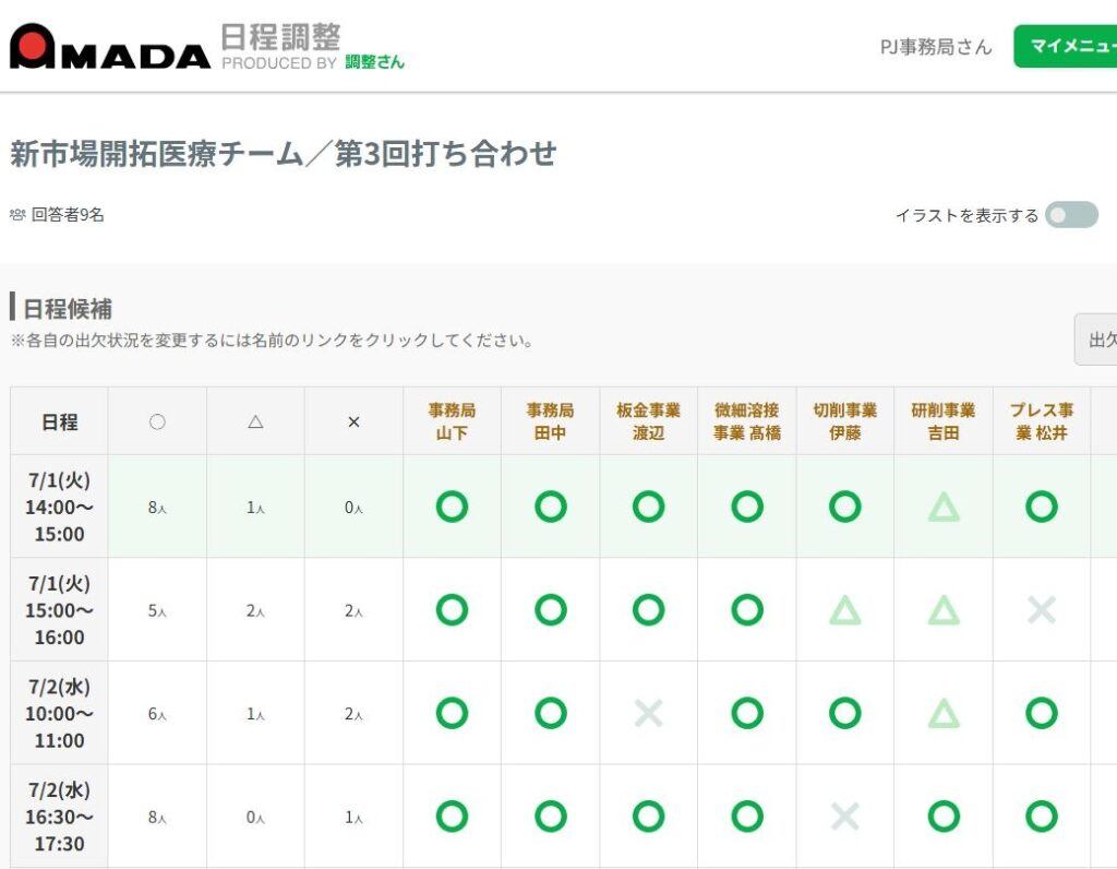 以前は「10人のうち7人はOK、3人はNG。その3人はいつなら空いているのか…」と何度も確認していたのですが、調整さんビジネスなら一目瞭然です。結果として、意思決定のスピードも速まりました。